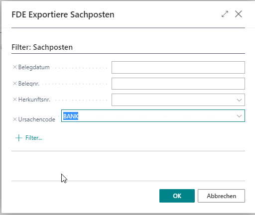 Hier können dann die Filter für dem jeweiligen Export gesetzt werden z.B. nach Datum, Belegnummer, URSACHENCODE = BANK oder KASSA,…..
