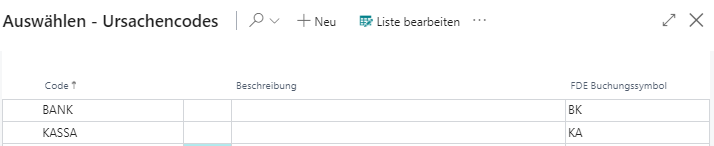 In den Buchblättern z.B. für Bank, Kassa, muss ein Ursachencode mit dem entsprechenden FDE Buchungssymbol hinterlegt werden:
