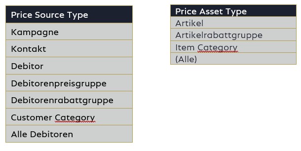 Über die Felder Priorität und Aktive kann die Preisermittlung gesteuert werden. Umso niedriger der Wert im Feld Priority, umso wichtiger der Eintrag. D.h. eine ermittelte Preislistenzeile, welche hinsichtlich der Kombination übereinstimmt, wird anderen Kombinationen mit höherem Wert im Feld Priorität bevorzugt. Neben den Kennzeichen für Prozesstyp, Währung, Einheit und Variante ergeben sich die Kombinationen aus der Preisquellenart und dem Preisanlageart: