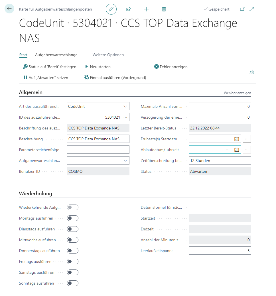 ID des auszuführenden Objekts Hier ist die ID 5304021 („CCS TOP Data Exchange NAS“) einzutragen.
