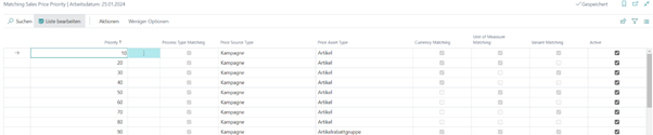 Über die Felder Priorität und Aktive kann die Preisermittlung gesteuert werden. Umso niedriger der Wert im Feld Priority, umso wichtiger der Eintrag. D.h. eine ermittelte Preislistenzeile, welche hinsichtlich der Kombination übereinstimmt, wird anderen Kombinationen mit höherem Wert im Feld Priorität bevorzugt. Neben den Kennzeichen für Prozesstyp, Währung, Einheit und Variante ergeben sich die Kombinationen aus der Preisquellenart und dem Preisanlageart: