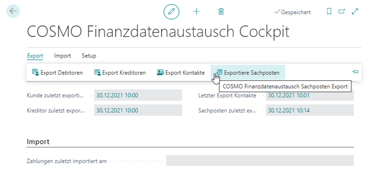 Der Export erfolgt über das COSMO Finanzdatenaustausch Cockpit über den Aufruf Export Sachposten:
