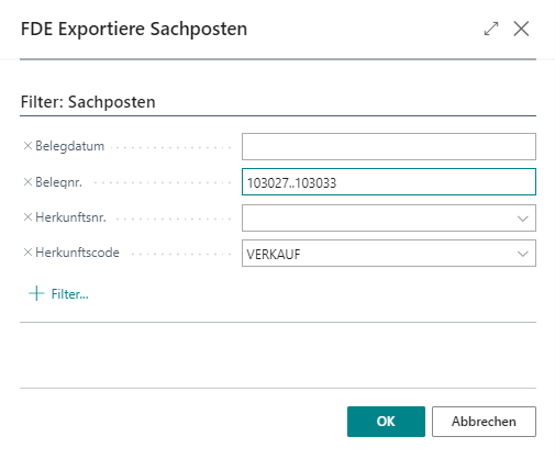 Hier können dann die Filter für dem jeweiligen Export gesetzt werden z.B. nach Datum, Belegnummer, Herkunftscode (VERKAUF),…..