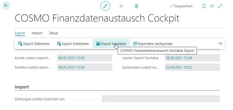 Der Export erfolgt über das COSMO Finanzdatenaustausch Cockpit über den Aufruf Export Kontakte: