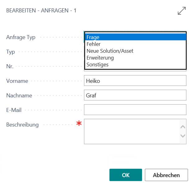 Wählen Sie die Art der Anfrage und beschreiben Ihr Anliegen.