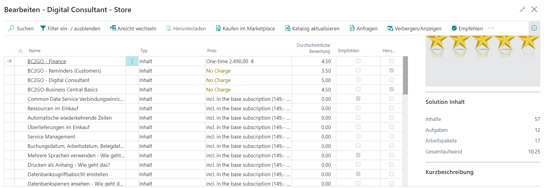 | Solution Inhalt | Inhalte: Anzahl der Inhalte, welche die Lösung beinhaltet<br / Aufgaben: Anzahl der Aufgaben, welche die Lösung beinhaltet. Arbeitspakete: Anzahl der Arbeitspakete, welche die Lösung beinhaltet. Gesamtaufwand: Dies ist eine Schätzung (in Stunden) von COSMO CONSULT, wie lange die Implementierung dieser Lösung in der Regel dauert. |