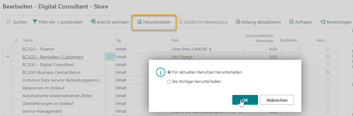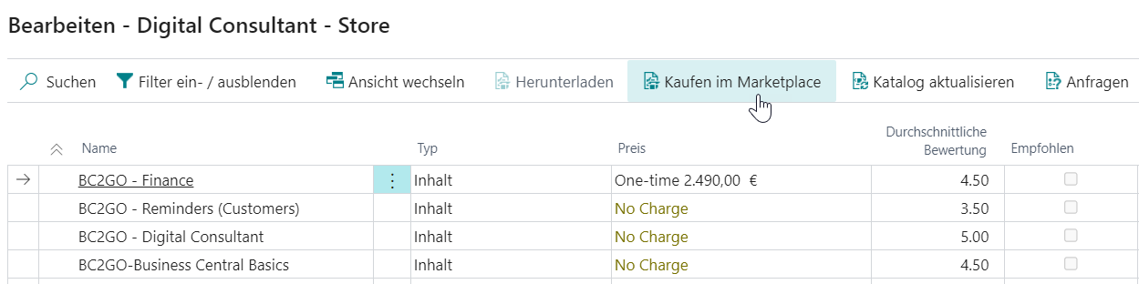 Für welche Primäre Rolle der Inhalt vorgesehen ist, finden Sie unter der Produktinformation des Inhaltes (siehe Informationen zu Inhalten). Würde Sie z.B. die Lösung BC2GO Finance "Für die aktuellen Benutzer herunterladen", dann würden die Benutzer mit der Primären Rolle KU-FI (Key User Finance), KU-SA (Key User Sales) und KU-PU (Key User Purchase) den Inhalt in ihrer Verwaltung wieder finden. Denn diese Rollen sind für die Bearbeitung der Aufgaben des Lösung vorgemerkt.