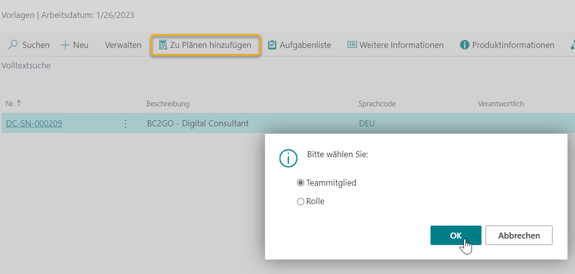 Dort können Sie das Projekt gezielt über die Option Zu Plänen hinzufügen bestimmten Benutzern oder Rollen zuweisen. Diese Option ist vor allem für den Projektmanager interessant, der Inhalte, die für viele in Ihrem Unternehmen relevant sind, entsprechend verteilen möchte.