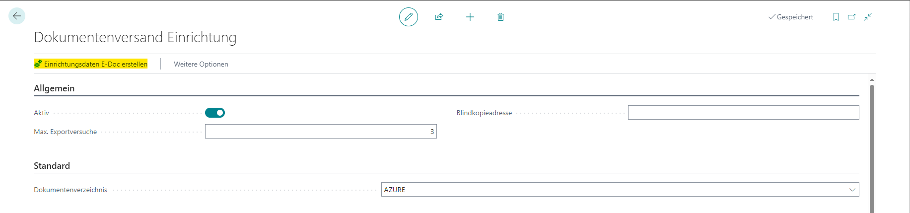 Unter Dokumentenversand Einrichtung erfolgen die generellen Einrichtungen von COSMO Document Dispatcher. Über die Funktion Einrichtungsdaten E-Doc erstellen, wird die Einrichtung, für die jeweiligen Dokumente, mit Standardwerten vorbefüllt. Wird für einen Debitor die Einrichtung aktiviert, so werden diese Standardwerte übernommen. Im Register Standard muss weiters ein Dokumentenverzeichnis hinterlegt werden. Dieses ist für die Speicherung der Dokumente notwendig.