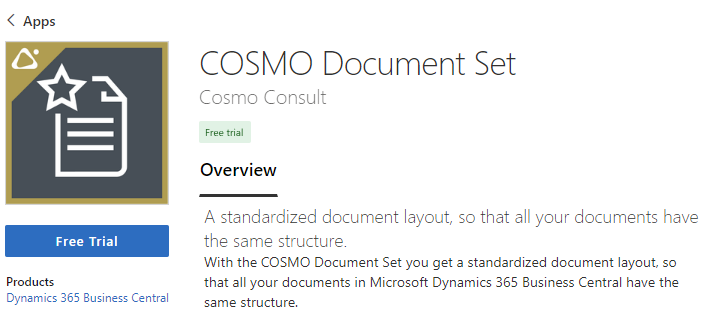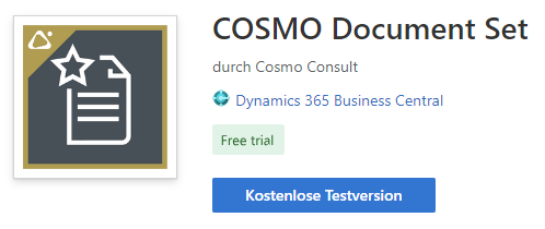 aus, geben Sie Erweiterungen ein und wählen Sie dann den entsprechenden Link. Suchen Sie nach COSMO Document Set im Marktplatz und wählen Sie Kostenlose Testversion. Folgen Sie den Anweisungen des Assistenten, um die Installation abzuschließen.
