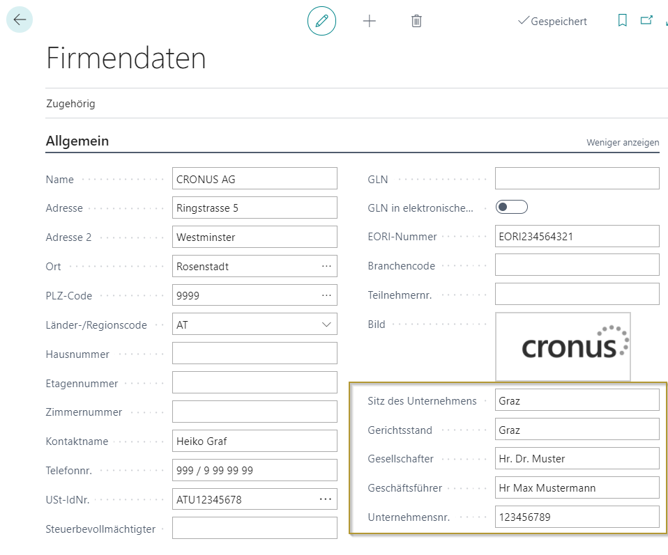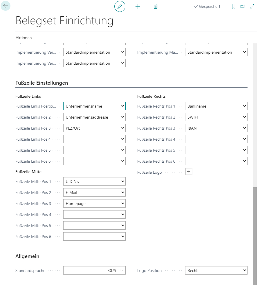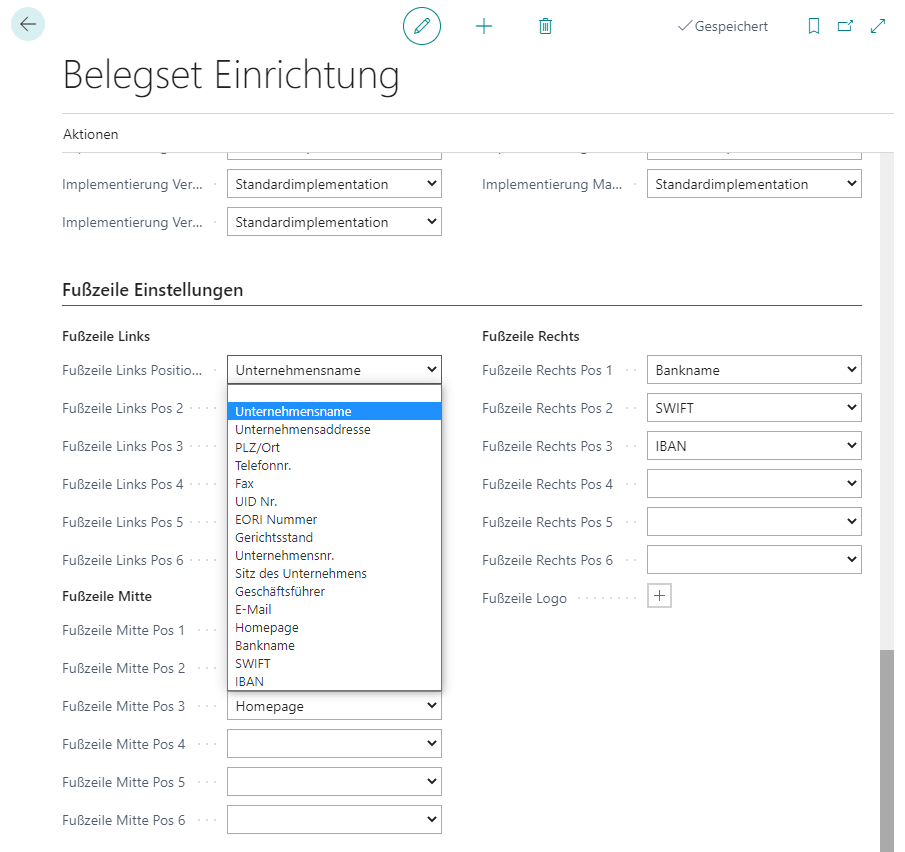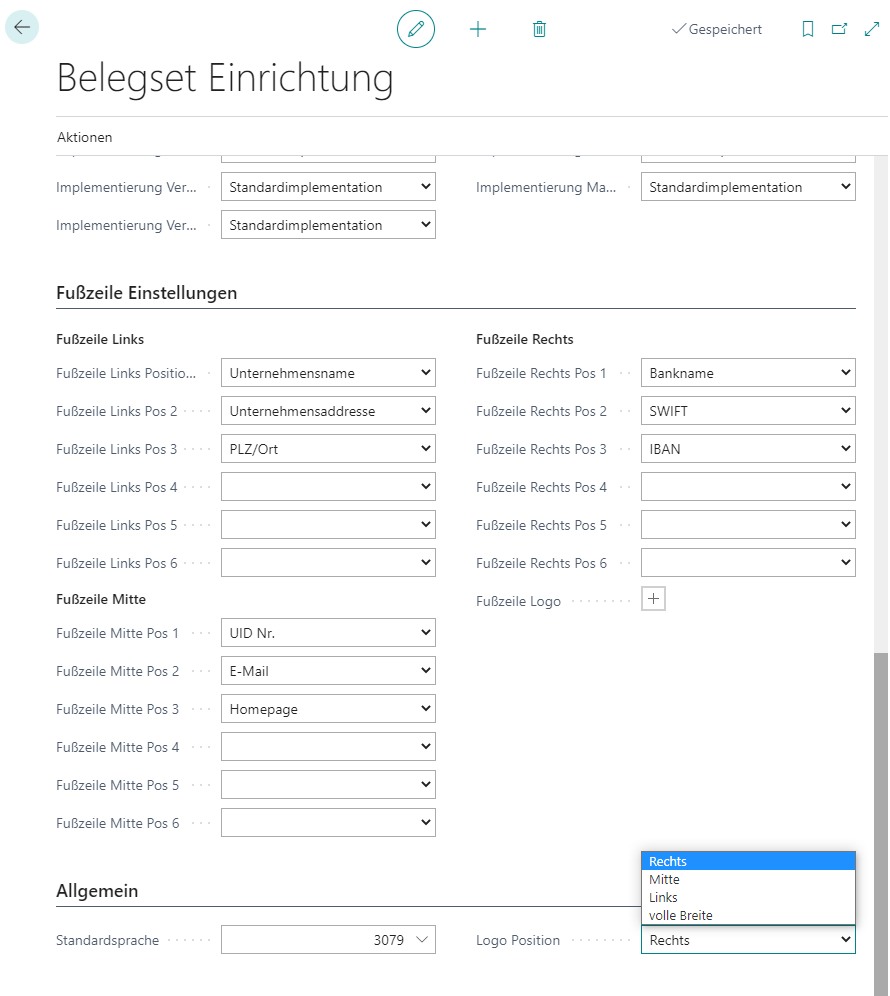 Im Fuß können entweder ein Logo oder die Informationen aus den Firmendaten individuell gesteuert werden. Aufruf von Belegset Einrichtung.