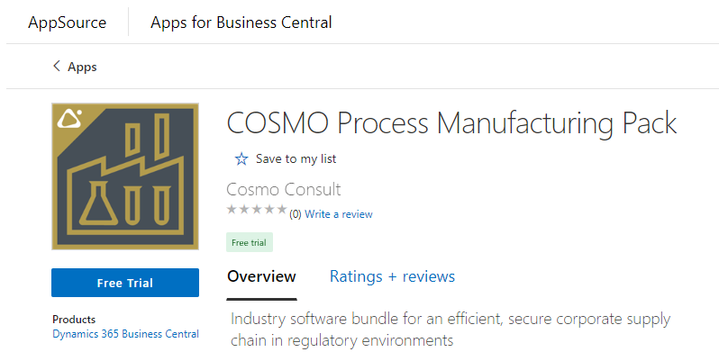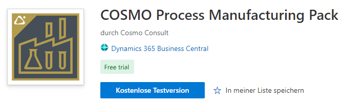 aus, geben Sie Marketplace für Erweiterungen ein und wählen Sie dann den entsprechenden Link. Suchen Sie im Marketplace nach COSMO Process Manufacturing Pack und wählen Sie dann Free Trial. Folgen Sie den Anweisungen des Assistenten, um die Installation abzuschließen.