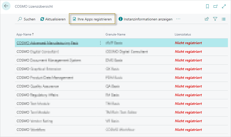 Die Apps werden auf der Seite COSMO Lizenzübersicht mit Status = Nicht registriert aufgeführt.