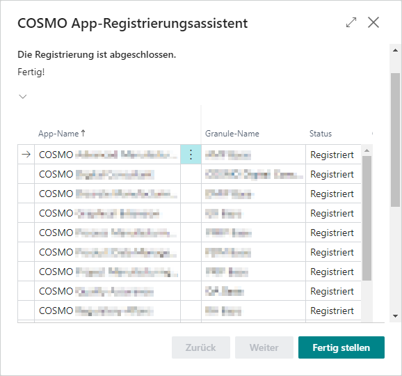 Die Apps haben den Status = Registriert. Wählen Sie die Schaltfläche Fertig stellen, um den Assistent zu schließen.