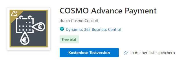 aus, geben Sie Marketplace für Erweiterungen ein und wählen Sie dann den entsprechenden Link. Suchen Sie im Marketplace nach COSMO Anzahlungsverwaltung und wählen Sie dann Free Trial. Folgen Sie den Anweisungen des Assistenten, um die Installation abzuschließen.