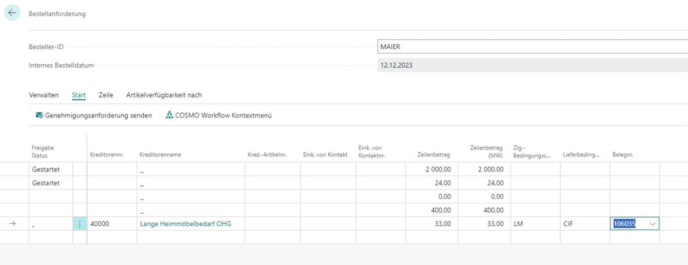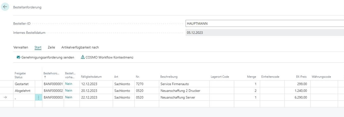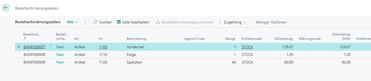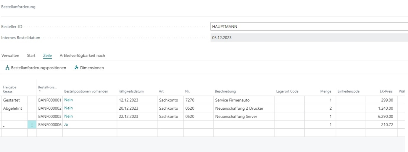 Die Bestellanforderung sollte nun wie in der vierten Zeile dargestellt werden.
