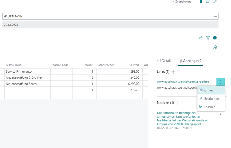 Zu einer Bestellanforderungen können auch weitere Informationen eingegeben werden. Dazu zählen Notizen, welche vom Benutzer eingegeben werden können und auch Links zu Webseiten.