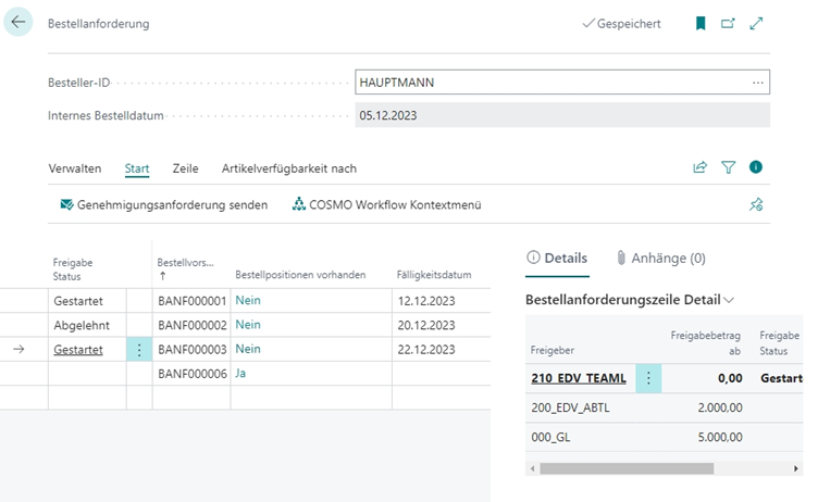 Nach Aufruf der Funktion Genehmigungsanforderung senden ändert sich der Freigabe Status der Zeile auf Gestartet und in den Beleganforderungszeilen Details wird nun ebenfalls angezeigt, dass die Freigabe in der ersten Stufe gestartet wurde.