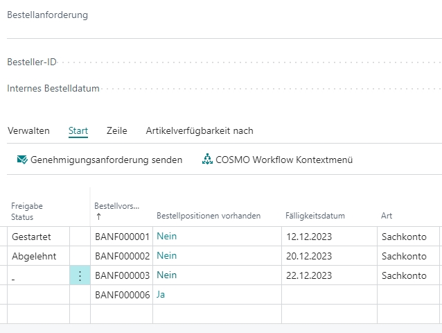 Ist eine Bestellanforderung angelegt, so wird über Feld Freigabe Status der Status der jeweiligen Zeile angezeigt.
