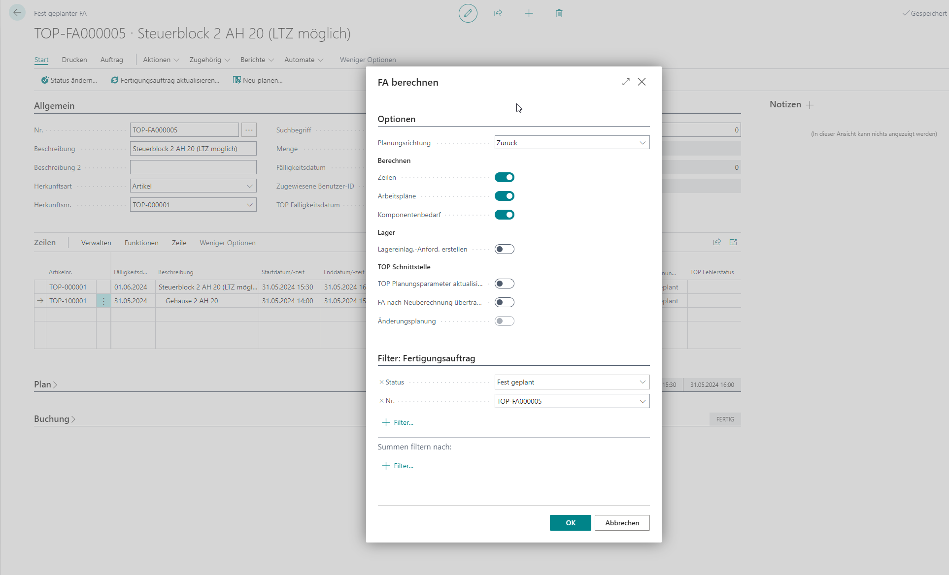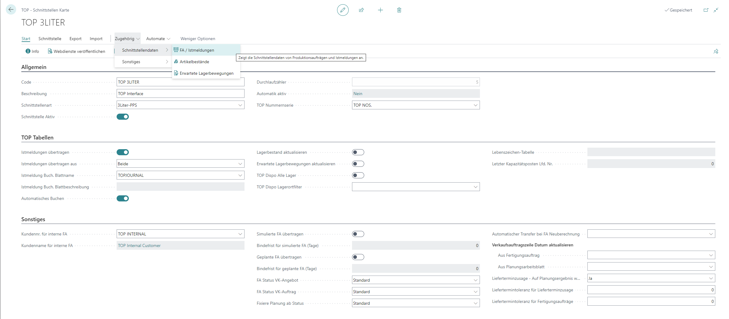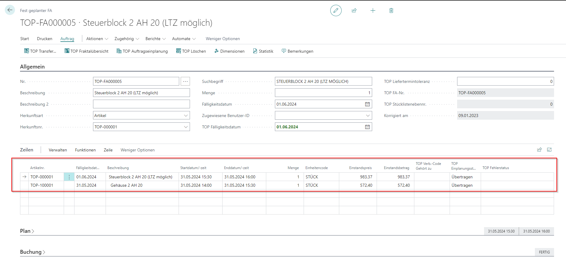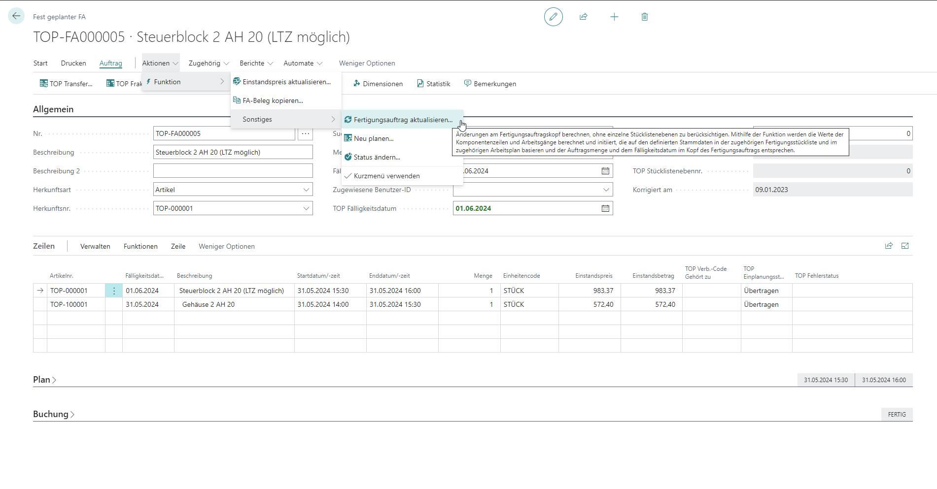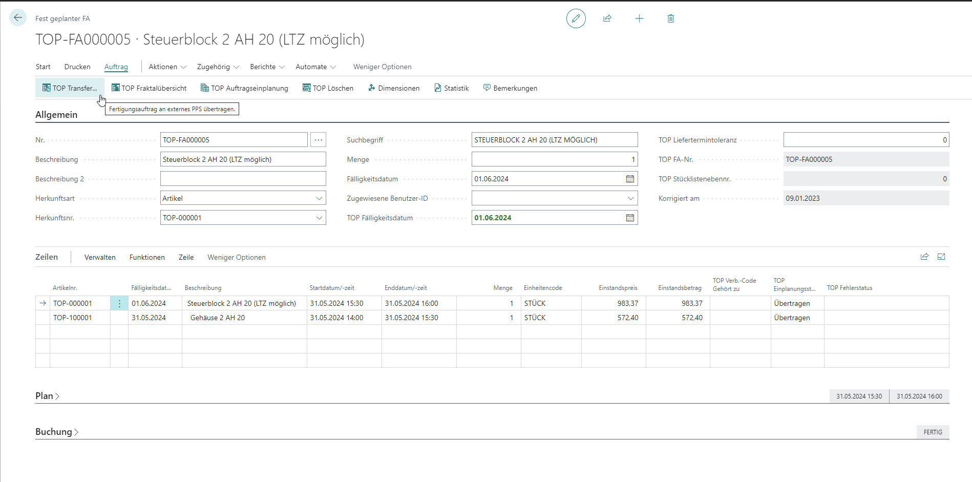 In der Page der Fertigungsaufträge gibt es dafür im Menü Auftrag die Funktion TOP Transfer.