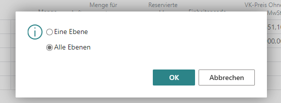 Werden alle Ebenen ausgewählt wird von unten nach oben durch die Fertigungsstückliste geprüft. Dabei spielt es keine Rolle ob der Artikel als Produktionsart Lagerfertigung oder Auftragsfertigung ausweist.