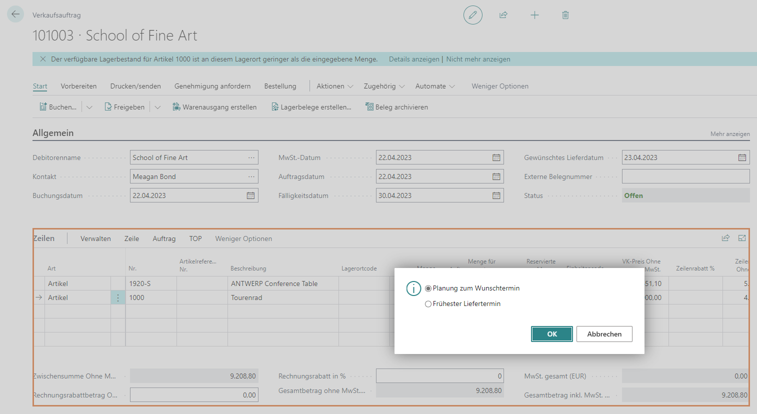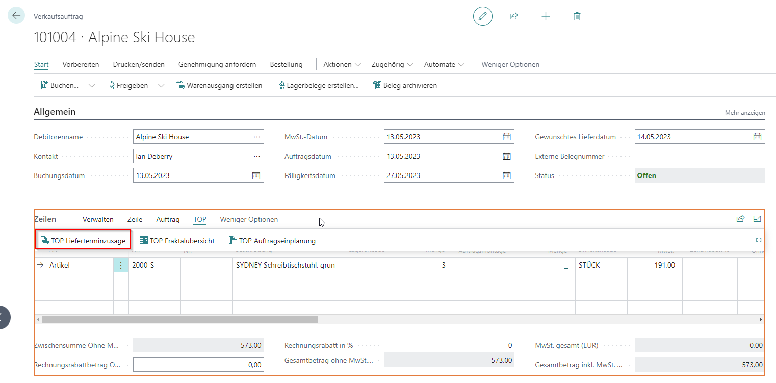 Die Lieferterminzusage ist eine Funktion am Angebot und Auftrag zur Prüfung und Bestätigung eines gewünschten oder Ermittlung eines frühesten Lieferdatums.
