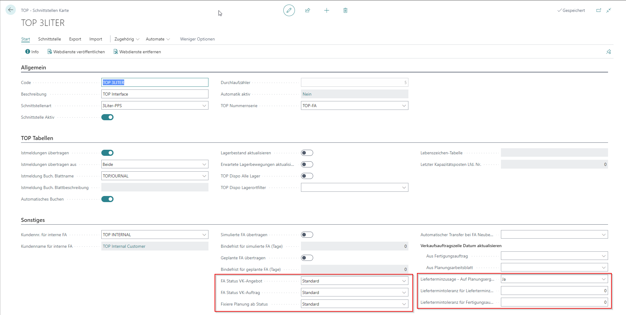 Für die Nutzung der beiden Funktionen ist die TOP Schnittstellen Einrichtung zu pflegen. Insbesondere die rot markierten Felder (siehe TOP Schnittstellen).