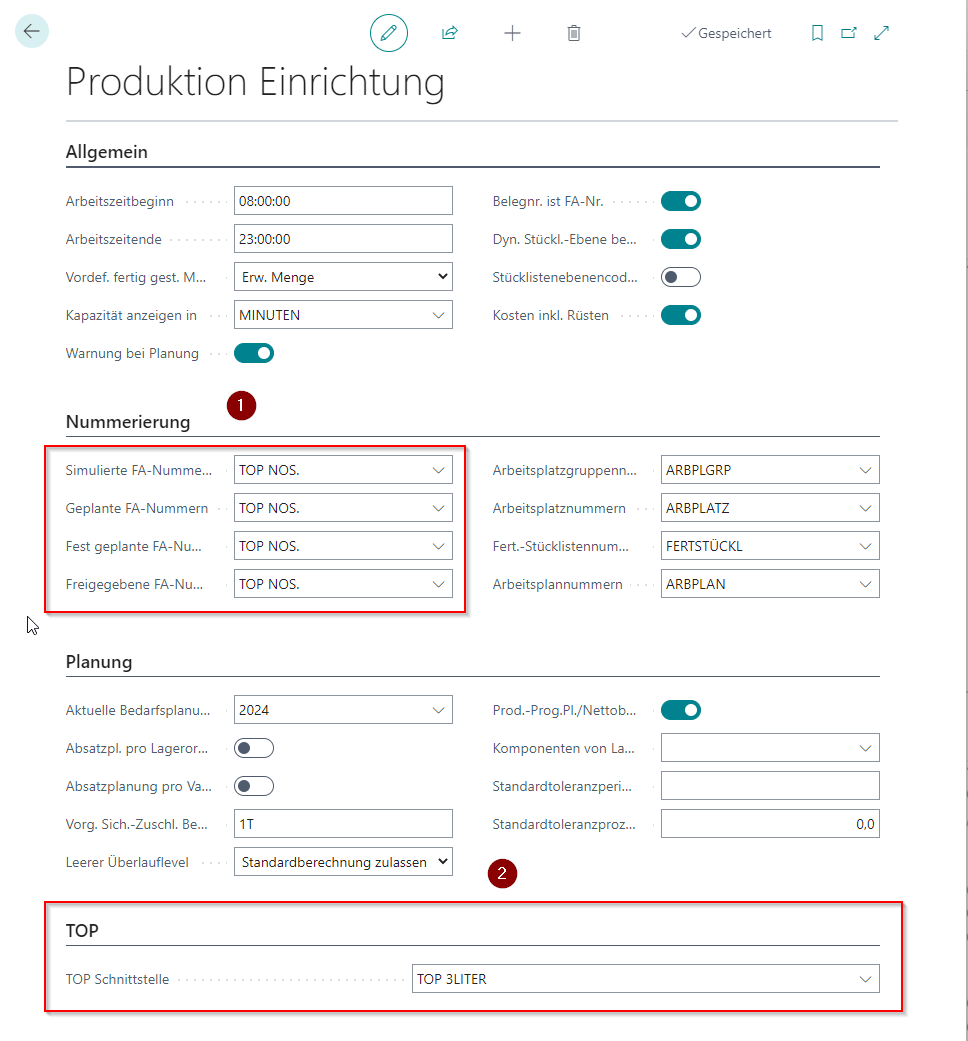 | TOP Nummernserie | Im Standard von Microsoft Dynamics 365 Business Central kann je Fertigungsauftragsstatus eine eigene Nummernserie hinterlegt werden. Im externen PPS muss aber ein Fertigungsauftrag eine einmal vergebene Nummer behalten, damit dieser immer wieder (auch bei Statuswechsel) referenziert werden kann. Aus diesem Grund kann hier eine allgemeine Nummernserie für Fertigungsaufträge hinterlegt werden, welche dann für alle Fertigungsaufträge in Microsoft Dynamics 365 Business Central, unabhängig von ihrem Status verwendet wird. |