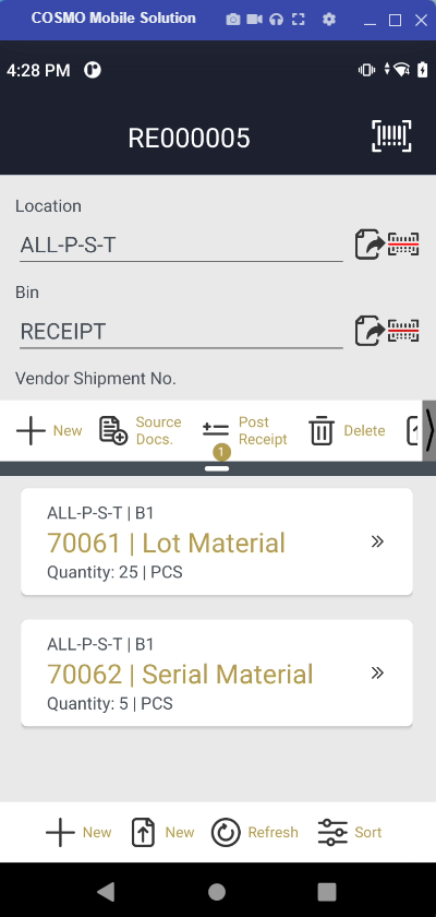 | PDF Function | The potential values include any function listed in the field list, which is customized for this purpose. Example: WhseReceiptDocument function on page 5308008 (Warehouse Receipt Header). It returns a Base64-encoded string to the mobile application, which contains the report of the unposted Warehouse Receipt of a specific record. |