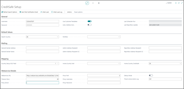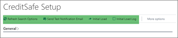 | Refresh Search Options | Retrieving all keys from Creditsafe to use Creditsafe in Business Central. It is necessary to use this function, after entering the username and password from Creditsafe. |