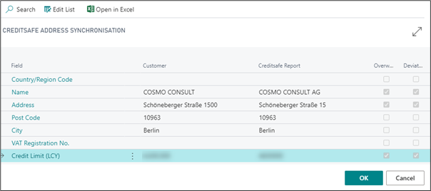 If automatic address synchronization is not enabled (see setup and administration guide for more information), it can be done manually. Using the button function Synchronize in ribbon bar Address, the target company can be selected (if there are multiple links) and any values from the credit report can be transferred to the customer, vendor or contact.