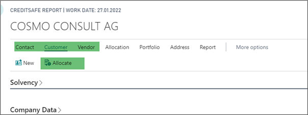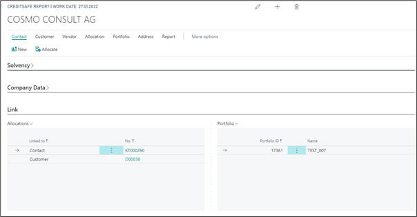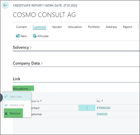 If there is no allocation the report was called without a link. In case this happened by mistake and a customer, vendor or contact already exists for the company, the report can be assigned using then button function Allocate in the ribbon bar for Customer , Vendor , or Contact. The Creditsafe ID is then linked to the selected customer, vendor or contact and all its business relations.