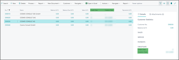 The Credit Class and Creation Date are then shown in the respective factbox, list and documents. The report can be opened using the lookup function of the creditsafe fields.