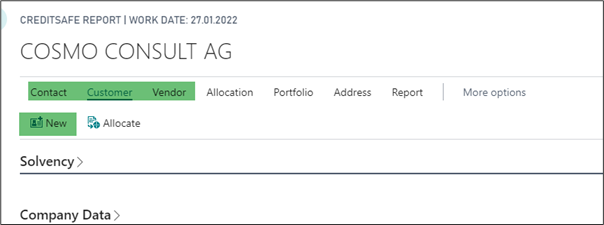 It is also possible to create a new customer, vendor or contact from a Creditsafe Report using the button function New in the ribbon bar for Customer , Vendor , or Contact. The information from the credit report will be transferred to the customer, vendor or contact and an allocation will be created.