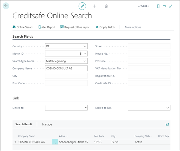 When all mandatory fields are filled with data, the button Online Search is enabled. If pressed, the search field entries are sent to the Creditsafe database. All data search results are shown in the subpage Search Results.
