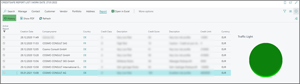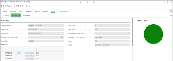 The credit report in Microsoft Dynamics 365 Business Central contains only the most important fields. The complete credit report can be viewed using the attached PDF document. It can be opened using the button Report and Show PDF onribbon bar.