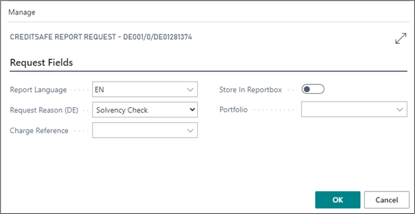 The fields in the request page Creditsafe Report Request are preallocated with the values from the setup (see setup and administration guide for more information).