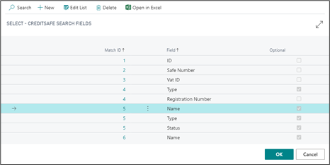 The Match ID controls which fields are active for searching in the selected country and are corresponding to the web service of Creditsafe. Using the lookup button in the Match ID field, the search type can be changed. All Fields with the same Match ID are enabled if a field is picked. At the bottom of the lookup Select from full list can be opened to see all details. If the value Optional is not set, the field is mandatory for this search group.