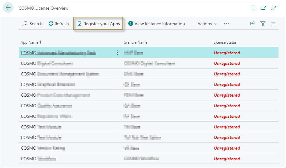The apps are listed in the COSMO License Overview page with Status = Unregistered.