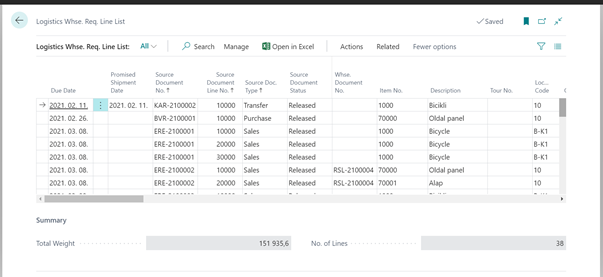The outbound warehouse request line list shows all the released and not yet handled outgoing request lines for planning the warehouse work.
