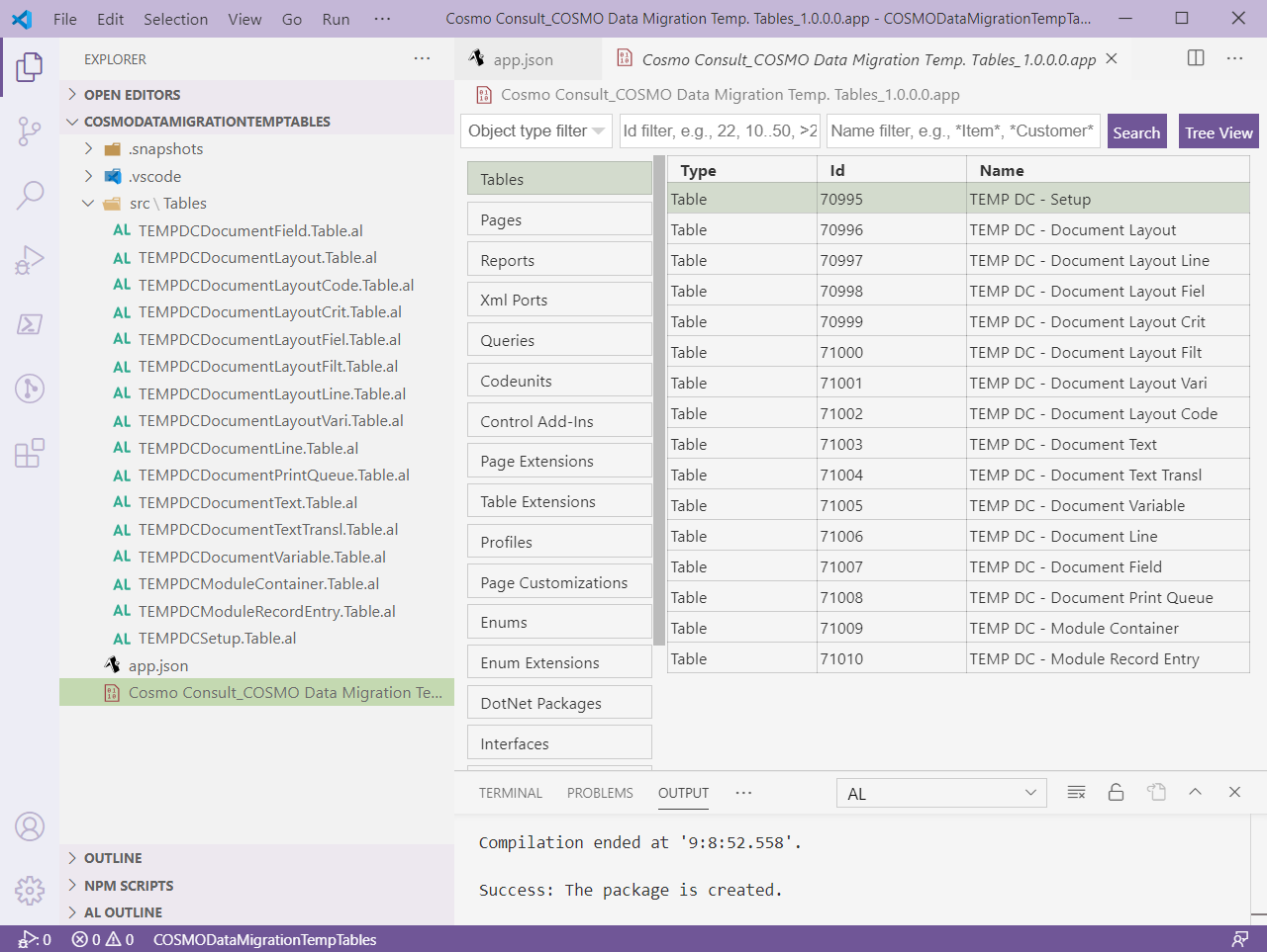Run the build task (Control + Shift + B) to create the final Data Migration Temp. Tables app for the COSMO Document Configurator app and store the .app file in the $AppFolderPath directory.