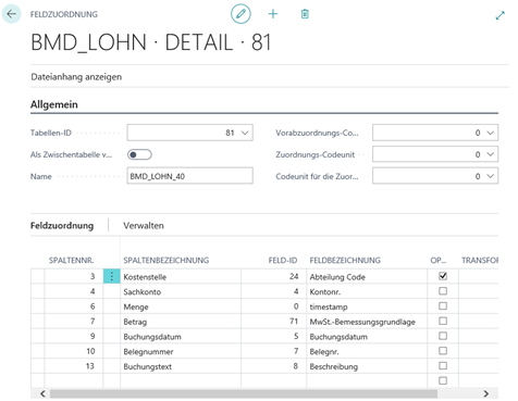 Für die Zuordnung in MICROSOFT DYNAMICS 365 BUSINESS CENTRAL gibt es im Register „Zeilendefinitionen" die Schaltfläche „Feldzuordnung": Hier wird das Mapping zur Fibu Buch.-Blattzeile hergestellt:
