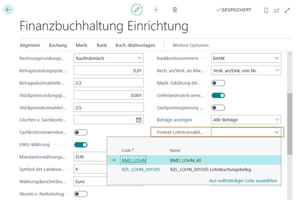 In der Finanzbuchhaltung Einrichtung muss über die Einstellung „Personalisieren" das Feld „Format Lohntransaktionsimport" hinzugefügt werden.