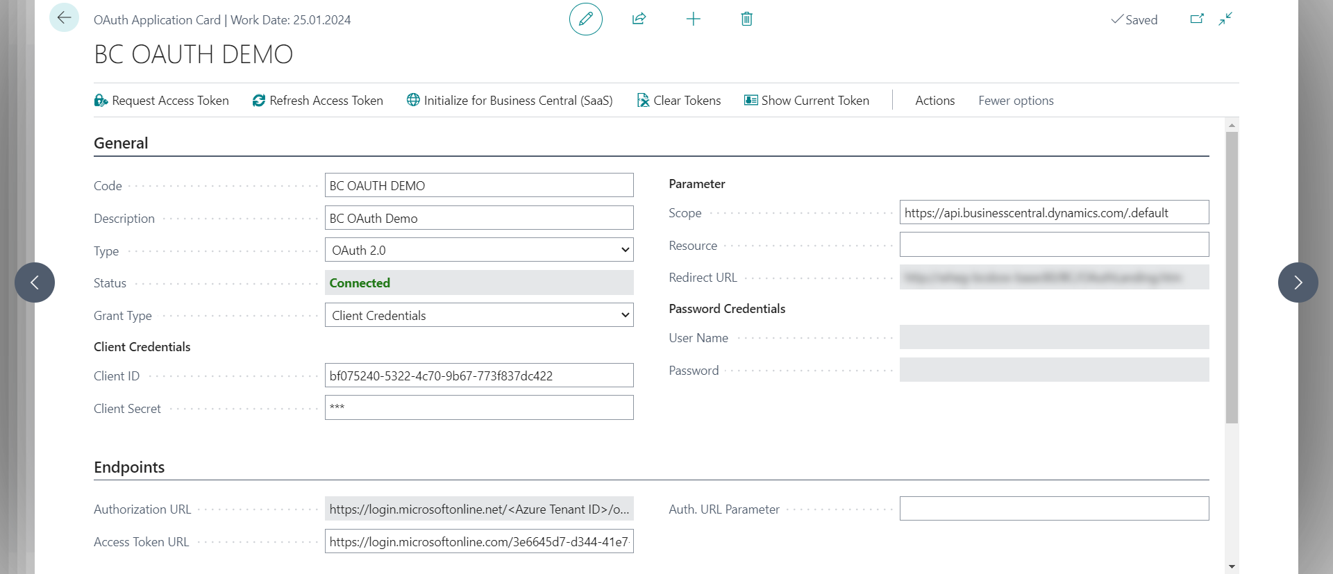 Business Central offers a fixed endpoint to handle OAuth callbacks. This endpoint must be entered correctly in both the redirect URL of the OAuth Application and the registered app in Azure portal. The URL is defined as https://<server name>[:<port>]/[<aad tenant id>/][<environment name>/]OAuthLanding.htm. An example for a SaaS environment is https://businesscentral.dynamics.com/e1894b46-5483-4e16-a0c6-0d039b12b488/Production/OAuthLanding.htm.