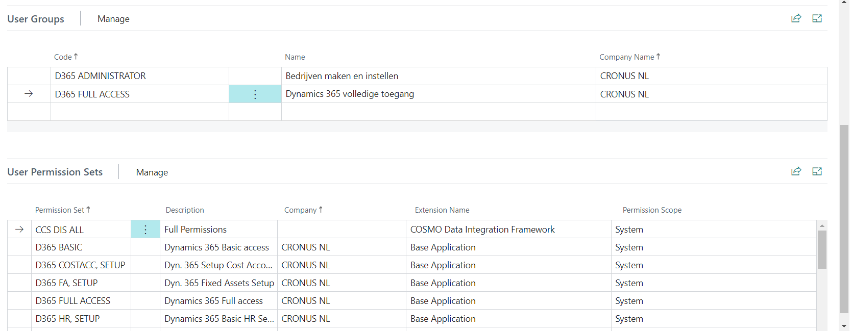 Scroll down the Azure Active Directory Applications page and set the desired permissions for the Azure application. The permission set SUPER must not be used. In this example, we use the D365 FULL ACCESS user group with sufficient permissions to transmit data into the Data Integration Framework app.