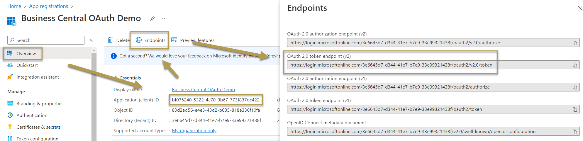 Find the client ID and Azure endpoints. Copy the values for the next steps. The endpoint version defines the used OAuth parameters, such as scope and resource. For Service to Service (S2S) authentication based on client credentials grant type, you will only need the OAuth 2.0 token endpoint (v2). For other grant types, you might also need the OAuth 2.0 authorization endpoint (v2).