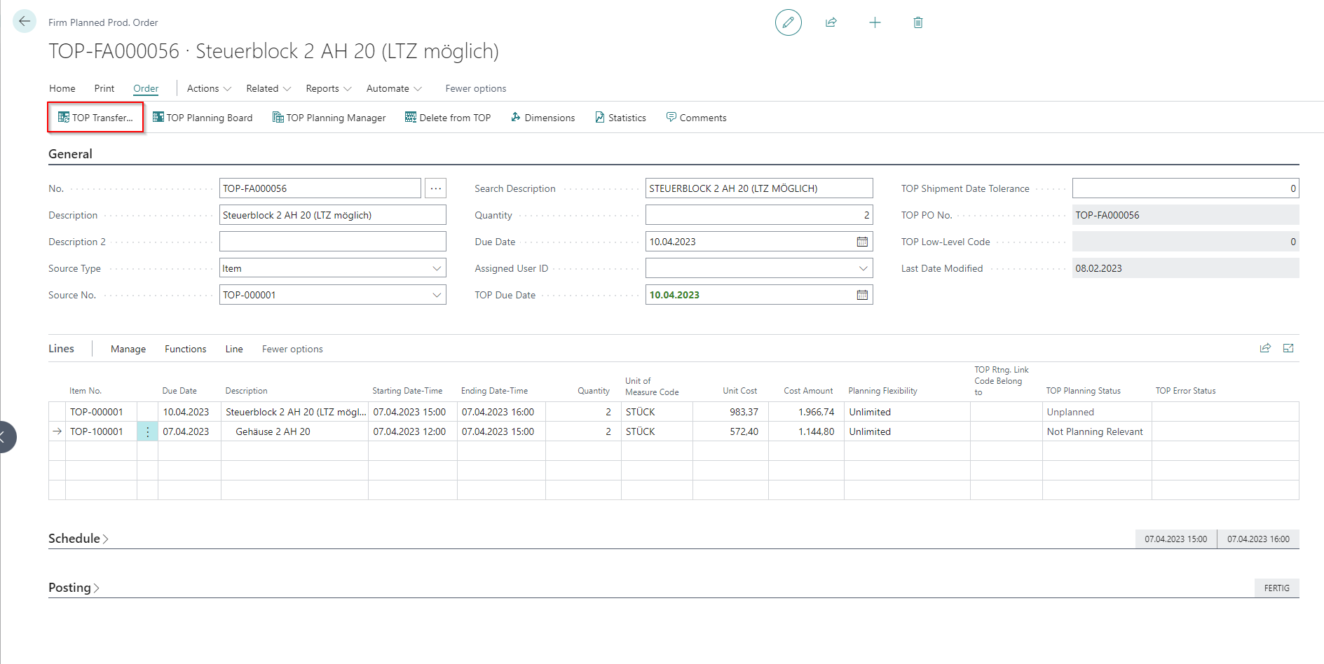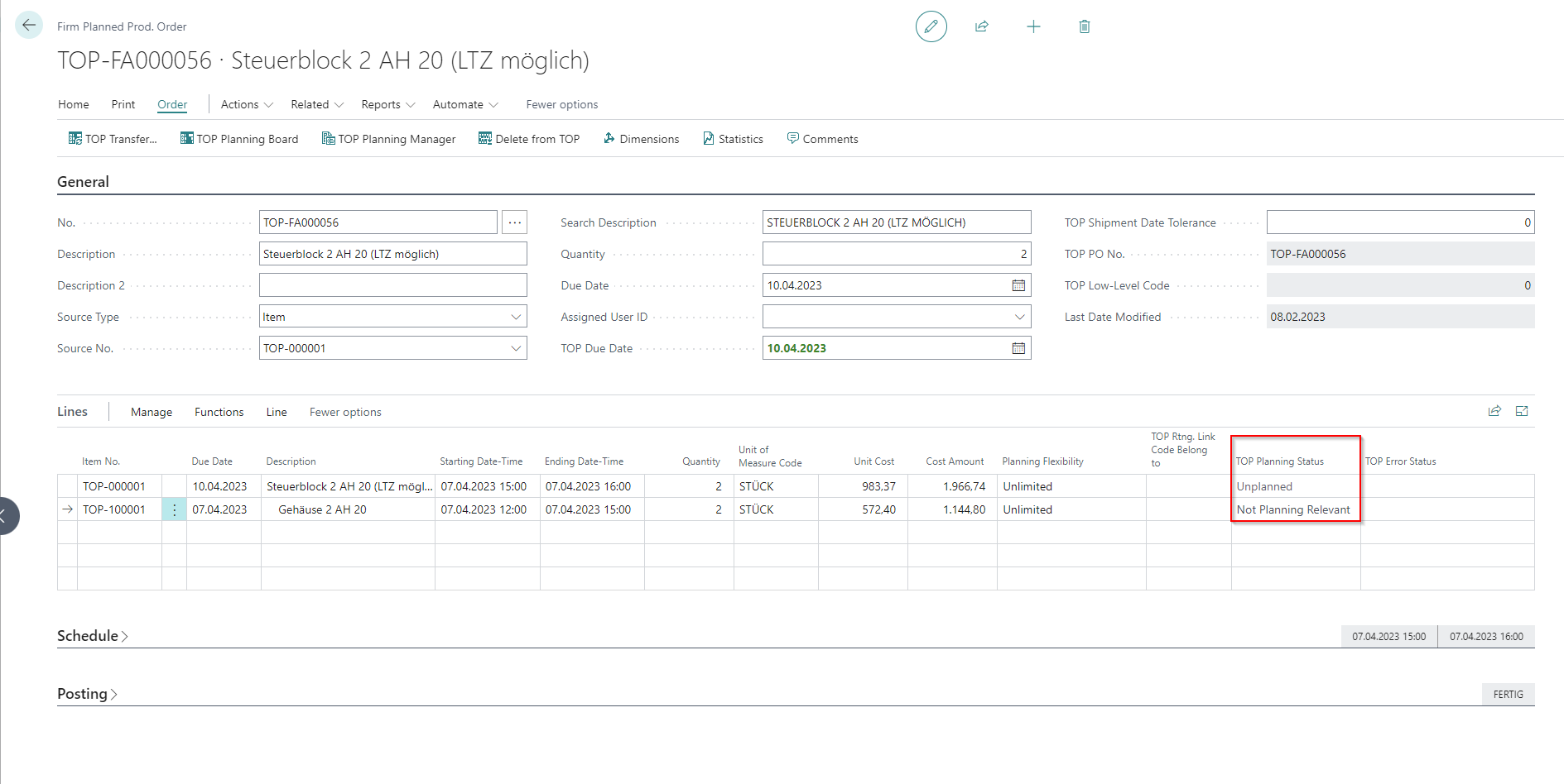 If Not Planning Relevant lines exist in a prod. order, it cannot be transferred. All other lines remain Unplanned. To transfer the prod. order, it must be specified why Not Planning Relevant has been set.