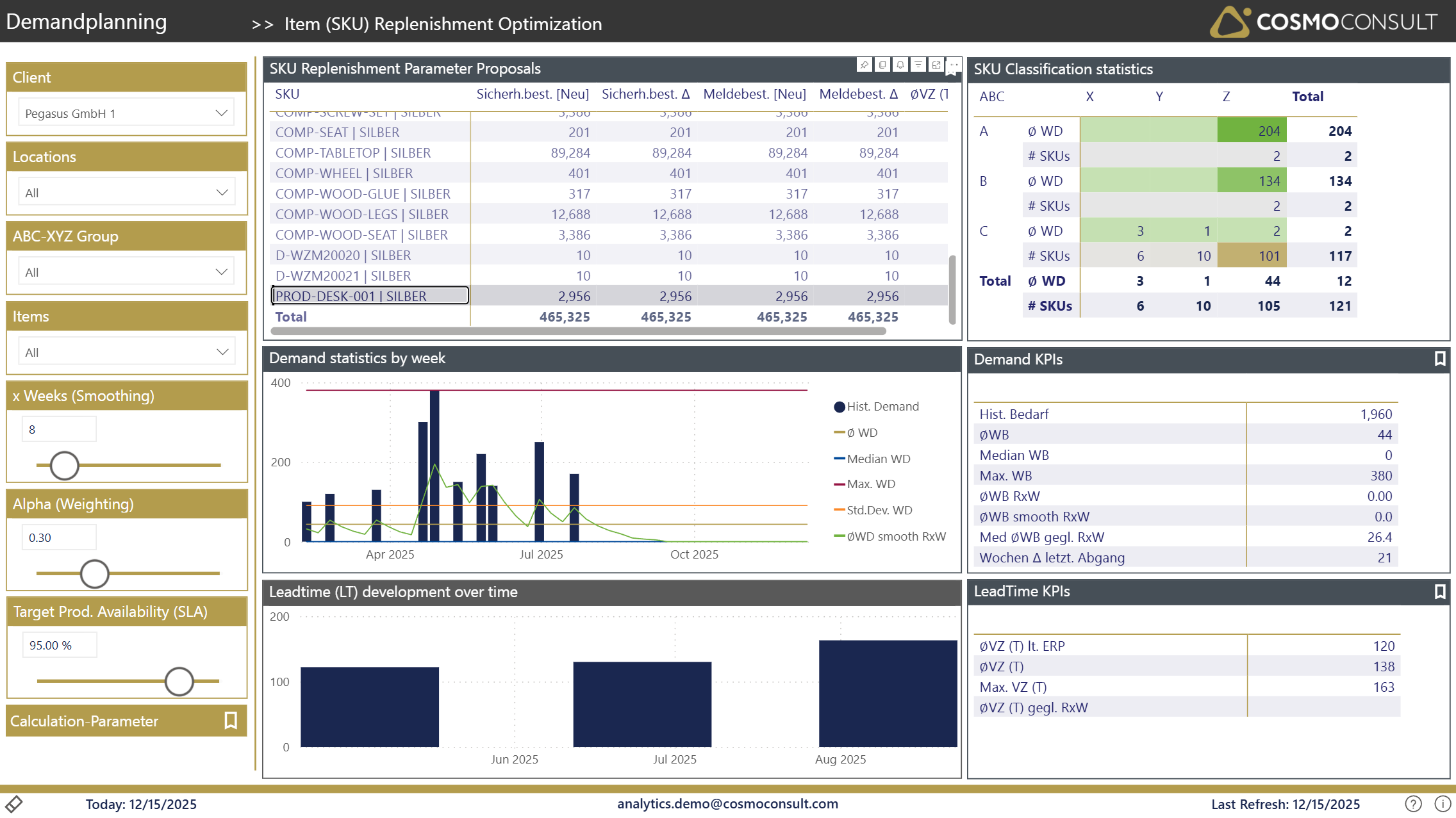 The Replenishment Optimization page provides advanced analytics for optimizing inventory replenishment parameters based on historical demand patterns, lead times, and target service levels. This page helps identify opportunities to improve SKU parameter settings.