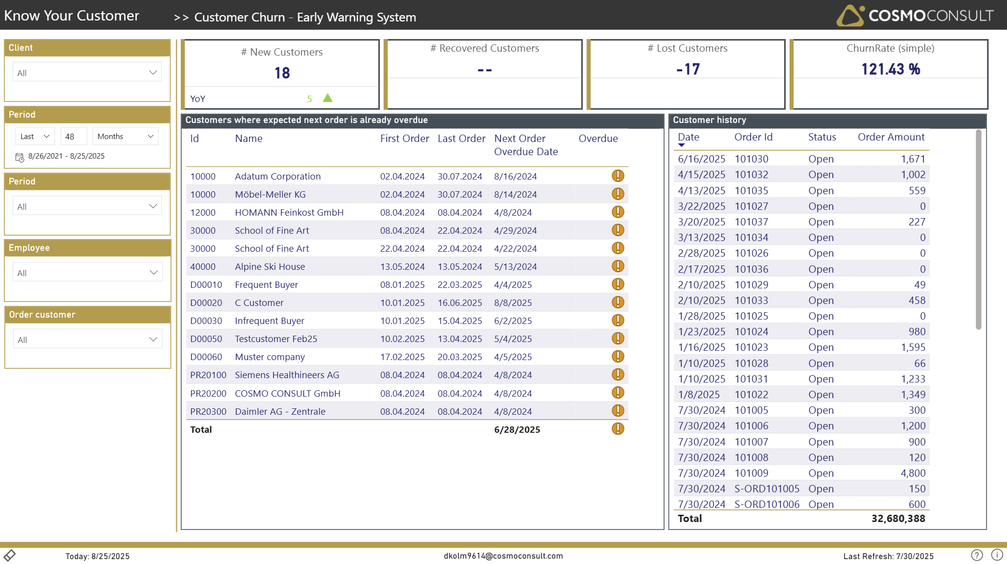 Monitoring the order frequency of your most loyal customers is essential. Imagine one of your top clients, usually placing an order every 4 weeks keeps silent for 6 or even 8 weeks without noticing that. Probability for Churn might be already high with a risk of loosing a loyal customer.
