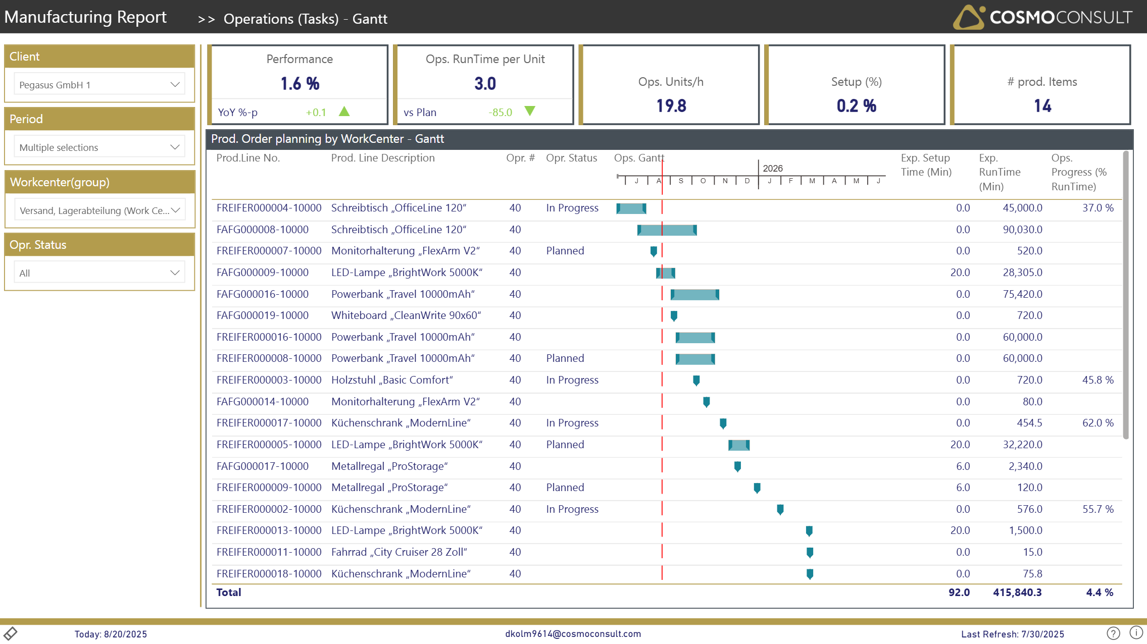 by filtering on a single Workcenter using the slicer, you can display all historic/current/upcoming production tasks on this work center. The view is sorted by startdate to easily get an overview about the status/progress of respective tasks.